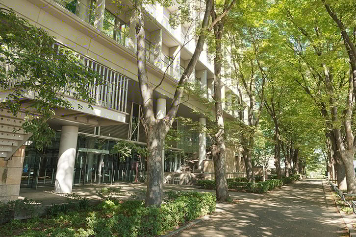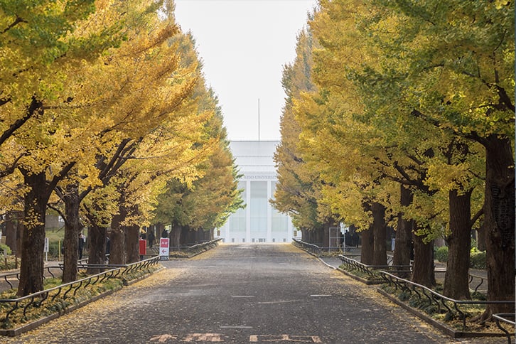 As soon as you pass through the ticket gates at Hiyoshi Station and begin walking down the magnificent avenue of ginkgo trees before you, you’re already on campus. The campus, covering approximately 330,000 square meters, has no gate at the entrance and provides an open atmosphere that blends seamlessly with the city. The Hiyoshi Campus, where first- and second-year students from seven faculties (first-year students only for the Faculty of Letters, School of Medicine, and Faculty of Pharmacy) and graduate students from three graduate schools pursue their studies, has a vibrant atmosphere.