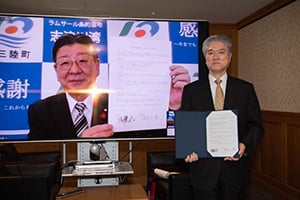 Keio University has concluded an agreement on collaboration and cooperation with Miyagi Prefecture Minamisanriku Town. The purpose of this agreement is to contribute toward mutual development and the enhancement of the regional community as well as education and research in the area through the use of cultural resources and the natural environment centered on forest resources possessed by Minamisanriku and Keio University as well as through collaboration and cooperation by both parties.