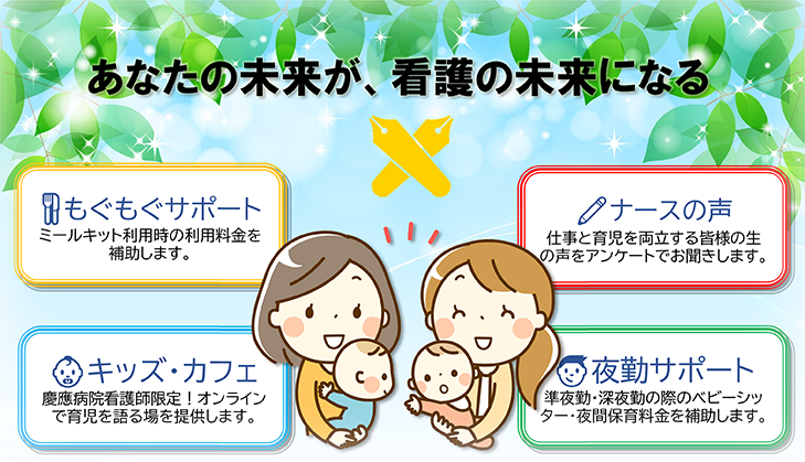 Since its establishment in April 2018, the Office for Diversity and Inclusion has been promoting the ""Keio University Childcare Support Program (KIDS)"" as part of its initiatives to establish work-life balance, supporting faculty and staff members who aim to balance work and childcare. On the other hand, the working styles of faculty and staff within the university are diverse, and the working arrangements of nurses and midwives working in the university hospital's nursing department are particularly unique, making it extremely challenging to balance work and childcare. Therefore, the Office for Diversity and Inclusion has decided to launch a new program, ""Nurse Kids☆Support,"" specifically tailored to the working styles of nurses and midwives. We hope that this new support program will be of some help to nurses and midwives in balancing their work and childcare responsibilities. Please note that this program will be reviewed and improved as appropriate based on your feedback. If you have any comments or suggestions, please do not hesitate to contact the Office for Diversity and Inclusion. (January 2023)