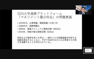 Vice-President Motohiro Tsuchiya spoke at Session 1 of the symposium, “The Role of University Management in Promoting the SDGs,” and reported on his discussions with partner universities as part of monthly workshops on “What University Management Should Aim for in Promoting the SDGs.”
