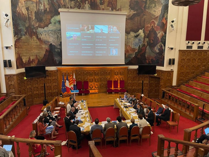 In 2019, the G7 Summit of developed nations was held in France, and at the call of the host country's President Macron, the U7+ Alliance of World Universities (University7+), a coalition of top universities centered on the G7 countries, was formed. It was a groundbreaking call from President Macron to reflect the opinions of the academic world in the G7 Summit. The in-person holding of this year's G7 Leaders' Summit was long undecided due to the COVID-19 pandemic and the Ukraine crisis, but it was eventually decided to be held at Schloss Elmau, Germany, at the end of June. Therefore, a U7+ Presidential Summit was hastily arranged to be held in person with whoever could attend, taking place on the Côte d'Azur in France (Nice and Cannes). Over 50 universities from around the world are members of the U7+, but about 15 presidents, including myself, gathered on-site, while others participated online. As you know, next year's (2023) G7 Summit will be held in Hiroshima. Therefore, next year's U7+ Presidential Summit will also be held in Japan, and I am pleased to announce that Keio University has been approved as the host institution. Presidents, vice-presidents, and staff from all over the world will gather at Mita! Because the decision to hold the meeting was made at short notice, the number of participants was small, but this is the group photo we took on the red steps. The U7+ meeting was held at the same venue as the Cannes Film Festival, and we took a commemorative photo lined up on the red carpet staircase that the stars ascend. The other photo is from the venue in Nice. Just one step outside! And so I'll also show a photo of the blue coast of Nice.