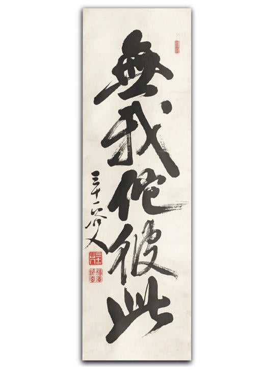 The characters are read as "Gatapishi nashi." This refers to the word "gatapishi" used when a door or window fits poorly and rattles. Derived from Buddhist terminology, it is a work that expresses a wish for harmony—capturing the truth that things are originally one, rather than viewing them in opposition such as self and other, or that and this. I imagine that the slightly exaggerated brush strokes were influenced by Nichiren's "Hige Daimoku" (though another work titled "Isson Anzen Muga Tapishi" once existed in Naganuma, its current location is unknown).