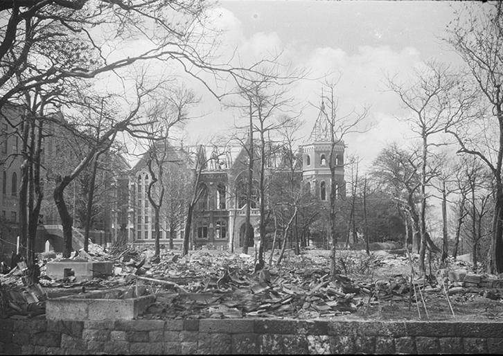 The ruins of the Mita Media Center (Keio University Library) amidst rubble, exposing a cruel wasteland. And beyond the slope of the "Maboroshi no Mon" towers the octagonal tower with its roof missing—this photograph, taken immediately after the air raid on May 25, 1945, is far too shocking for those of us today who know the peaceful days at Mita. One might say it vividly conveys the devastation brought by war—but in fact, these photographs require considerable annotation.