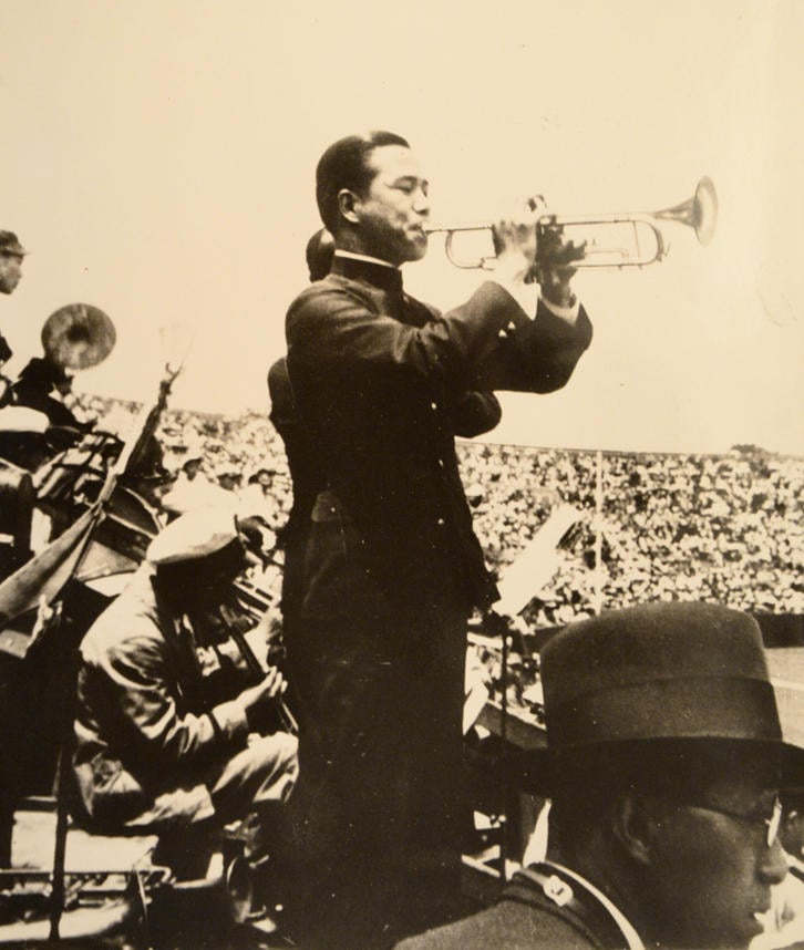 A single photograph taken during the Waseda-Keio rivalry in the autumn of 1932 (Showa 7). The person playing the trumpet is Takeo Masunaga, the singer Ichiro Fujiyama. He was capable of playing not only the piano but also the accordion, violin, flute, and all kinds of percussion instruments.