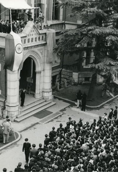 As Prime Minister Nehru stood before the microphone, the enthusiastic crowd suddenly fell silent. "President, respected professors, young men and women students," Prime Minister Nehru began, and the audience hung on his every word. Although Prime Minister Nehru's speech was short—only about ten minutes—his voice alone echoed across the hill of Mita. Prime Minister Nehru spoke to the Keio students.