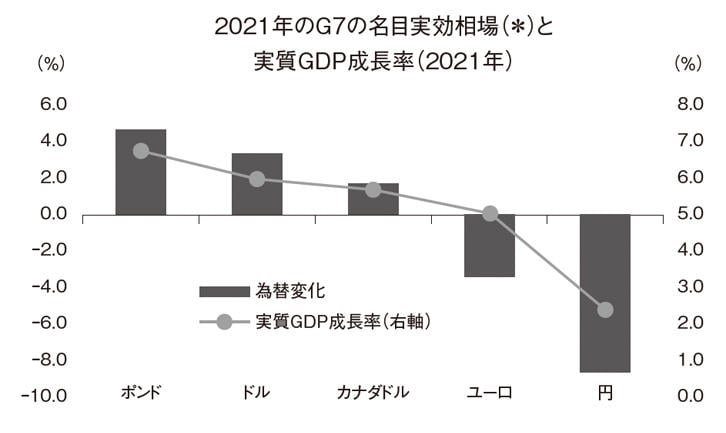 First is point (1). Looking back at 2021, the growth rate gap between the West and Japan became quite significant. Regarding Western economies, they did not fixate on behavioral restrictions with an eye toward the post-COVID era, and ran through 2021 at a pace two to three times their potential growth rate to make up for the delay in 2020. In contrast, the Japanese economy remained obsessed with the level of new infections and preferred a path of stagnation while fearing some form of behavioral regulation. Even in early July at the time of writing, while the West is suffering from rising prices due to tight employment and wage conditions, Japan is daily making social issues out of "whether or not to wear masks" and "whether or not to continue entry restrictions." There is no way to compete under these circumstances. The foreign exchange market is likely not so simple that "high or low growth rates" directly translate to "currency strength or weakness," but there is a strong suspicion that at least in 2021, the "weakness of the Japanese economy" was directly linked to the "weakness of the yen" (Chart 1).
