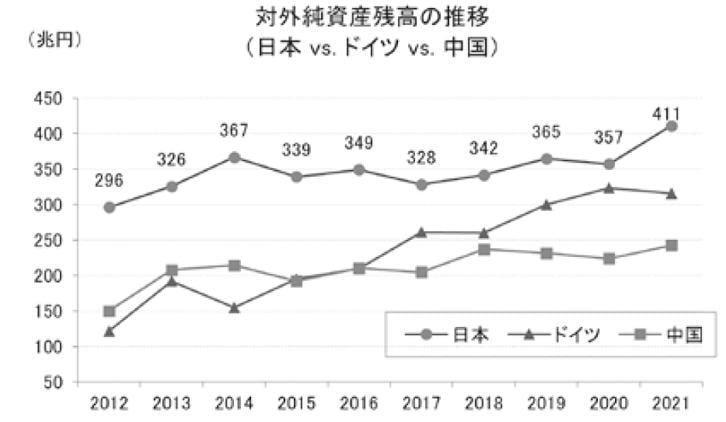 Regarding the current account, if the decrease in the surplus or the fall into a deficit continues, the cumulative increase in net external assets, which has been taken for granted until now, could also stop. Of course, if the yen depreciates, the balance increases due to the price effect. In fact, the net external asset balance at the end of 2021 increased for the first time in two years to 411.1841 trillion yen, up +56.1 trillion yen from the previous year, and the gap with second-place Germany (315.7 trillion yen) widened to nearly 100 trillion yen. This means it has maintained its position as the "world's largest net external asset holder" for 31 consecutive years. However, when breaking down the factors for the +56.1 trillion yen increase, the amount that increased purely due to volume (transaction flow) factors was +10.8 trillion yen, and the rest was due to price factors. Price factors are divided into exchange rate factors (fluctuations in exchange rates) and other adjustments (fluctuations in asset prices), with the former at +62.2 trillion yen and the latter at -16.8 trillion yen. In short, the increase in net external assets in 2021 was almost entirely the result of yen depreciation. The ability to earn and accumulate foreign currency through current account surpluses (the room for increase due to flow factors) is declining.