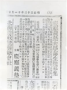 This is an advertisement for student recruitment to Keio Gijuku’s colleges, published in the Jiji Shimpo newspaper in 1889.