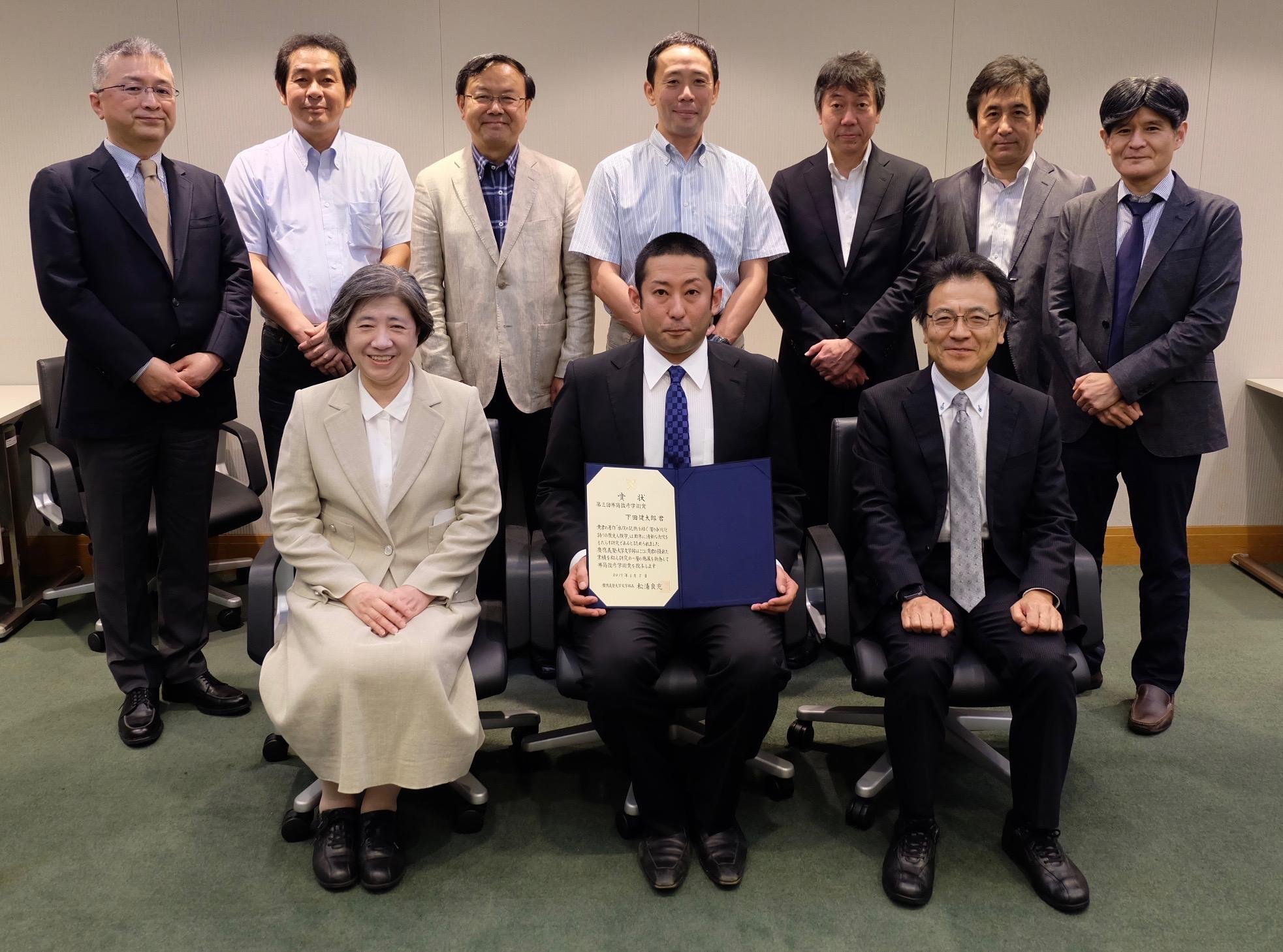 The award ceremony was held on Wednesday, June 26, at the Mita Campus. Selection Committee Chairperson Keiko Kurata explained the reasons for the selection, followed by the presentation of the certificate and supplementary prize to the author of the winning work, Mr. Kentaro Shimoda, by Yoshimitsu Matsuura, Dean of the Faculty of Letters.