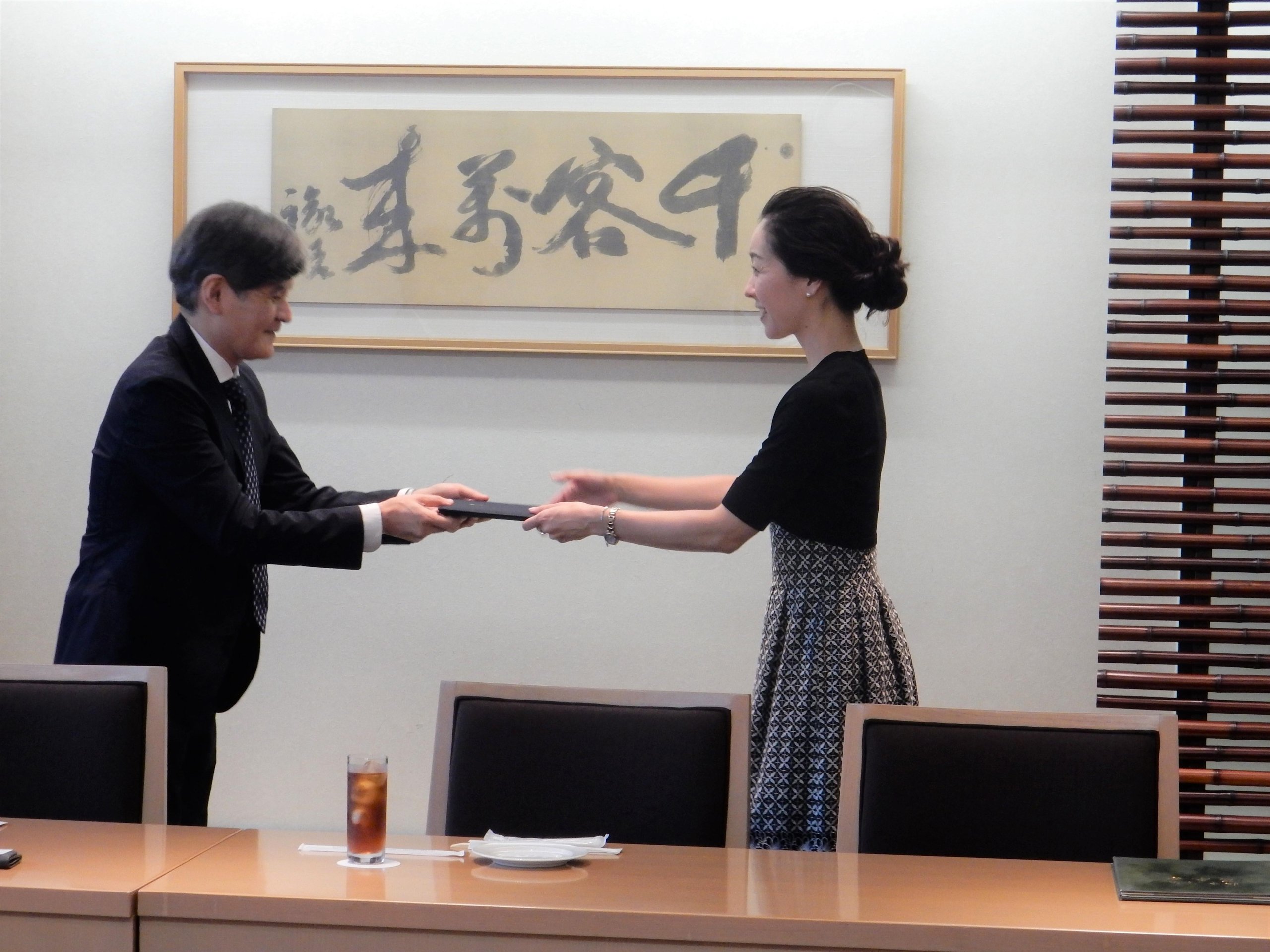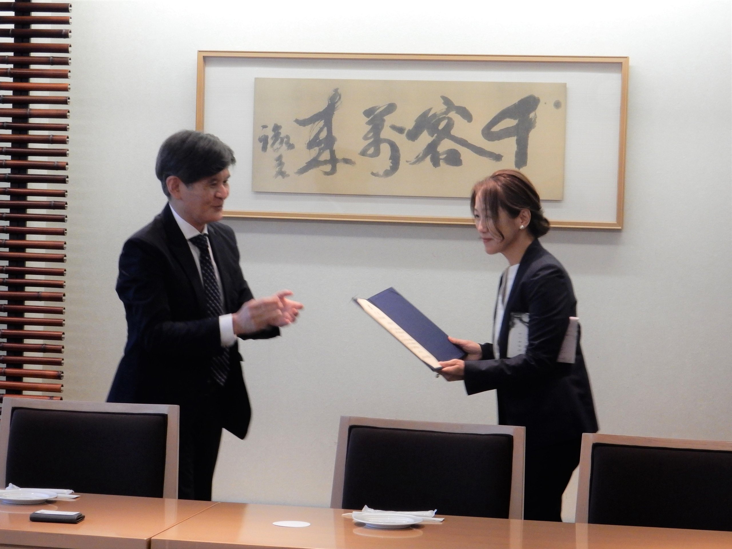 The award ceremony was held on Tuesday, July 9, at the Mita Campus. Takao Sato, Dean of the Faculty of Letters, presented award certificates and supplementary prizes to the winners, Maiko Kodaira and Natsuko Kuwabara. Congratulatory remarks were also offered by the selection committee of the Nishiwaki Junzaburo Academic Award.