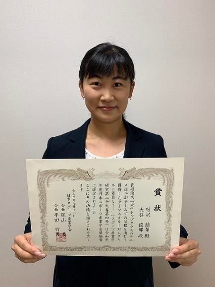 The paper by Eri Nozawa, an alumna of the Ph.D. program at our graduate school, titled "Life Skills Acquired by Top-Class University Tennis Players through Team Activities: Focusing on Interpersonal Skills" (published in the "Journal of Sport Industry Studies," vol. 29, no. 4), was selected for the Encouragement Award by the Japanese Society of Sport Industry and was presented at the 30th General Meeting of the society's conference on July 11.