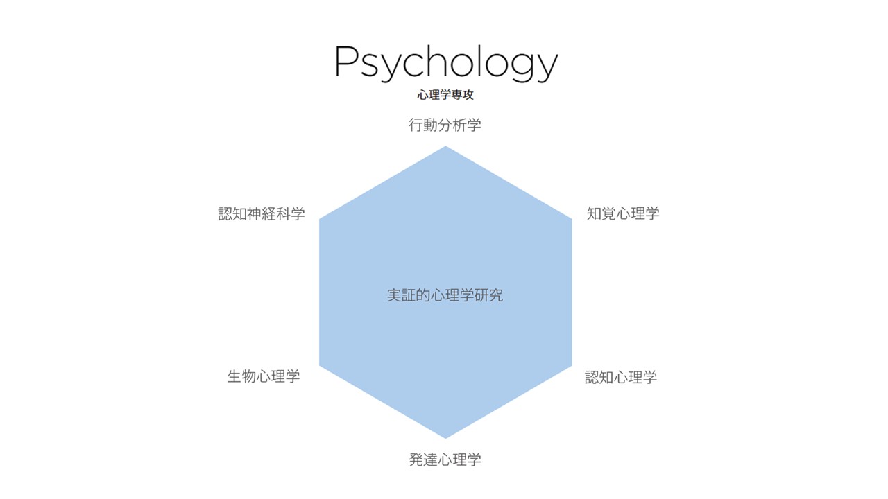 The Major in Psychology focuses primarily on empirical research grounded in the methodologies of experimental psychology. The aim of the major is to train graduate students pursuing psychology as an empirical science to be able to conduct rigorous experiments and perform thorough data analysis. Areas of specialization among the tenured faculty cover a diverse range of fields, from basic-level experimental psychology through to the psychology of learning, perceptual psychology, cognitive psychology, developmental psychology, psychophysiology, and neuropsychology.