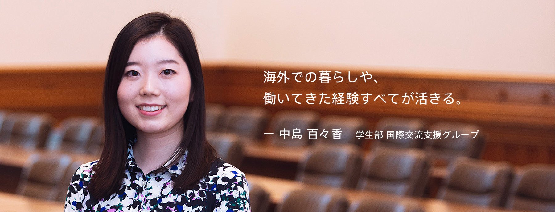 I believe that all of my experiences—living abroad, my student life at Keio, my work experience after joining the workforce, including both the things I loved and the things I struggled with—are now useful in my job at Keio University. It's been almost a year since I changed jobs, but in my current workplace, my supervisors listen carefully even to my suggestions and give me opportunities to start new things. For example, when I suggested incorporating videos for study abroad promotion because students today are not keen on reading, my idea was adopted, and we were also able to start using social media. There are many things I understand precisely because I worked at a PR company. I love my alma mater, so I find my work very rewarding and enjoyable. When I meet professors on campus who helped me during my student days, it feels like I've gone back to being a student, which makes me very happy.