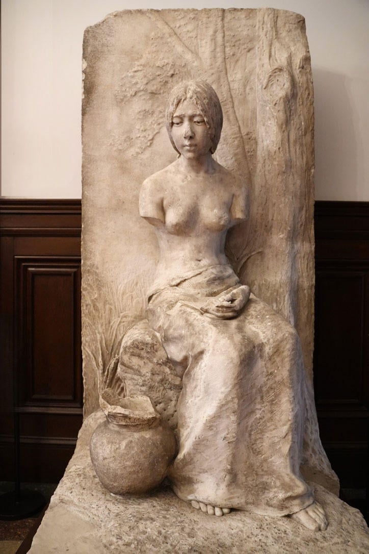 On the Mita Campus, numerous works of art have been erected to pass down the records of the war as historical facts to future generations, to console the souls of the war dead, and to express a desire for peace. "Tekona," located on the first floor of the Old University Library, is a marble sculpture (c. 1909) by the sculptor Shikai Kitamura, based on the tragic woman from the "Manyoshu." It was severely damaged in the air raids, losing both arms, but was unveiled to the public in 2009 (Heisei 21) for the first time in over 60 years. During the restoration work, a method was chosen to not completely wash away the soot from incendiary bombs, so as not to let the historical fact of the war fade away.