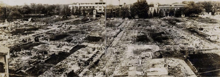 The Old University Library after being burned down in an air raid (Photo by Toho-sha, collection of the Center of the Tokyo Raids and War Damage)