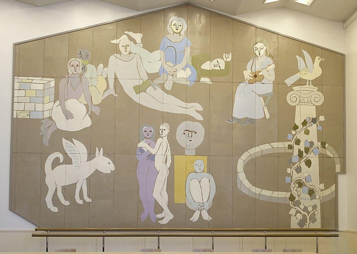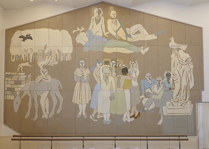 The "Student Hall" was completed in 1949 (Showa 24). On the east and west walls of the student cafeteria inside, a mural by Genichiro Inokuma titled "Democracy" was displayed, depicting young men and women singing and talking freely with the arrival of postwar democracy. After the hall was demolished, this work was moved to the co-op cafeteria in the West School Building, where it continues to watch over students today. The triangular shape at the top is a remnant of the roof shape from its time in the Student Hall.