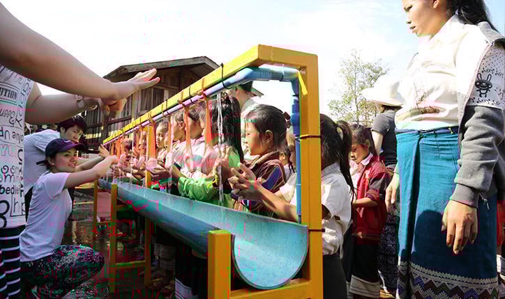 During their 10 days abroad, students spend two nights and three days in a remote village and stay with local families while conducting sanitation and hygiene education at a school in the area. Students visit the same elementary school every year, so they inherit techniques and equipment from former project participants and have an opportunity to add their own ideas and improvements. One of these ideas was a hand washing station at one of the elementary school. Current students heard that the station had been built two years prior, in 2016, but upon arrival at the school they found that parts of it were either rusted or broken. It seems that many villagers had used it to wash vegetables, but there was no sign that children had used it to wash their hands. Upon further investigation, students decided to fix the now defunct hand washing station. They repainted it, swapped broken parts for new ones, and brought in soap, a rare commodity in the area. They then taught the children how to use the station to wash their hands, once again teaching the children the importance of washing their hands and explaining to the teachers how to maintain the equipment.