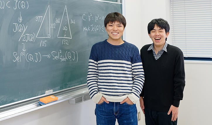 There is only one pair (up to similitude) of isosceles and right triangles for which the lengths of all sides are integers and which share the same perimeter and area. This was proven by a pair of Ph.D. candidates, Yoshinosuke Hirakawa and Hideki Matsumura, both members of Prof. Kenichi Bannai’s Arithmetic Geometry and Number Theory Mathematical Science Team. The problem was originally the brainchild of Matsumura, who invited senior classmate Hirakawa to work with him on the project. “Hirakawa is fascinated by the beauty of integers,” Matsumura says, and together they took four months to prove their theorem. Their findings were published in an American academic journal and even made national headlines here in Japan. Both aspiring researchers, they say they hope to take on other problems in the future to prove to the public that the world of mathematics really is a fascinating place.