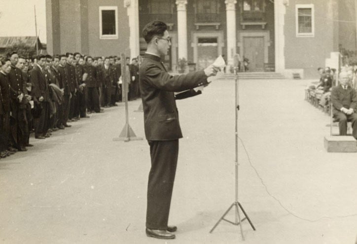 The Keio University Centennial Ceremony was held at the Hiyoshi Commemorative Hall on November 8, 1958, and was attended by 4,654 people from Japan and overseas, including Emperor Showa, the presidents of the University of Tokyo and Waseda University, and by representatives from Harvard University. As the first modern educational institution in Japan to celebrate its centennial, there was a great deal of public interest, and even a commemorative postage stamp was issued in Keio’s honor. At the ceremony, Japan's Minister of Posts and Telecommunications presented the first printed sheet of these stamps to then Keio president Fukutaro Okui.