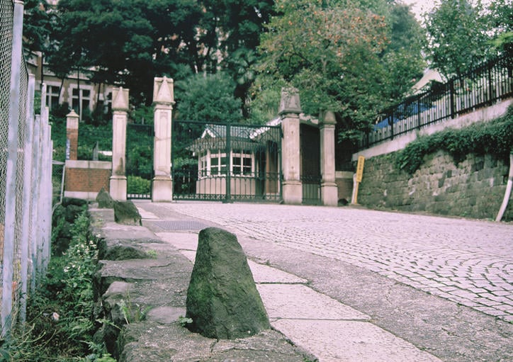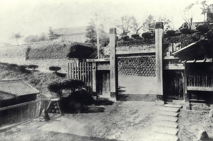 If you slip through the arched passageway of the East Research Building on Mita Campus and follow the sloping path left to campus, you are greeted halfway by the pillars ofMaboroshi no Mon(lit. "phantom gate"), Keio's former main gate. The gate dates back to the early Meiji period, just after Fukuzawa moved his school to Mita. At the time, the entrance facing Mita Dori Avenue was Keio's front door. Here we trace the origin and history behind this entrance, affectionately known asMaboroshi no Mon, which has kept a careful watch over Keio for more than 150 years. It has become an iconic symbol of the university, even becoming the title of a popular Keio school song.