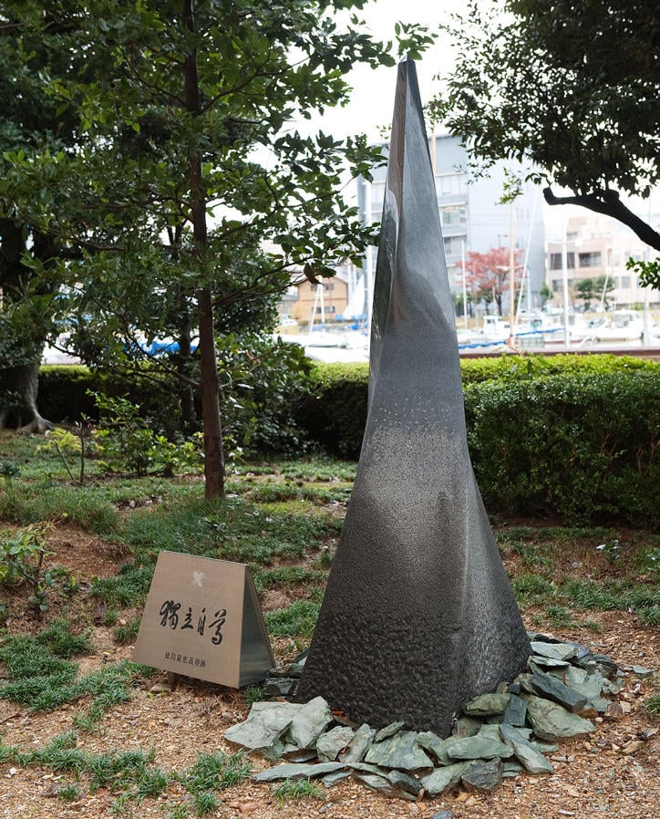 In April 2001, the Tokushima Keio Club spearheaded the construction of a spiraling black-granite monument with a stainless steel nameplate. The nameplate bears the inscriptiondokuritsu-jison("independence and self-respect"), skillfully engraved in Fukuzawa's own handwriting. Following a change in land ownership, the monument was relocated to the prefectural government building in 2009.