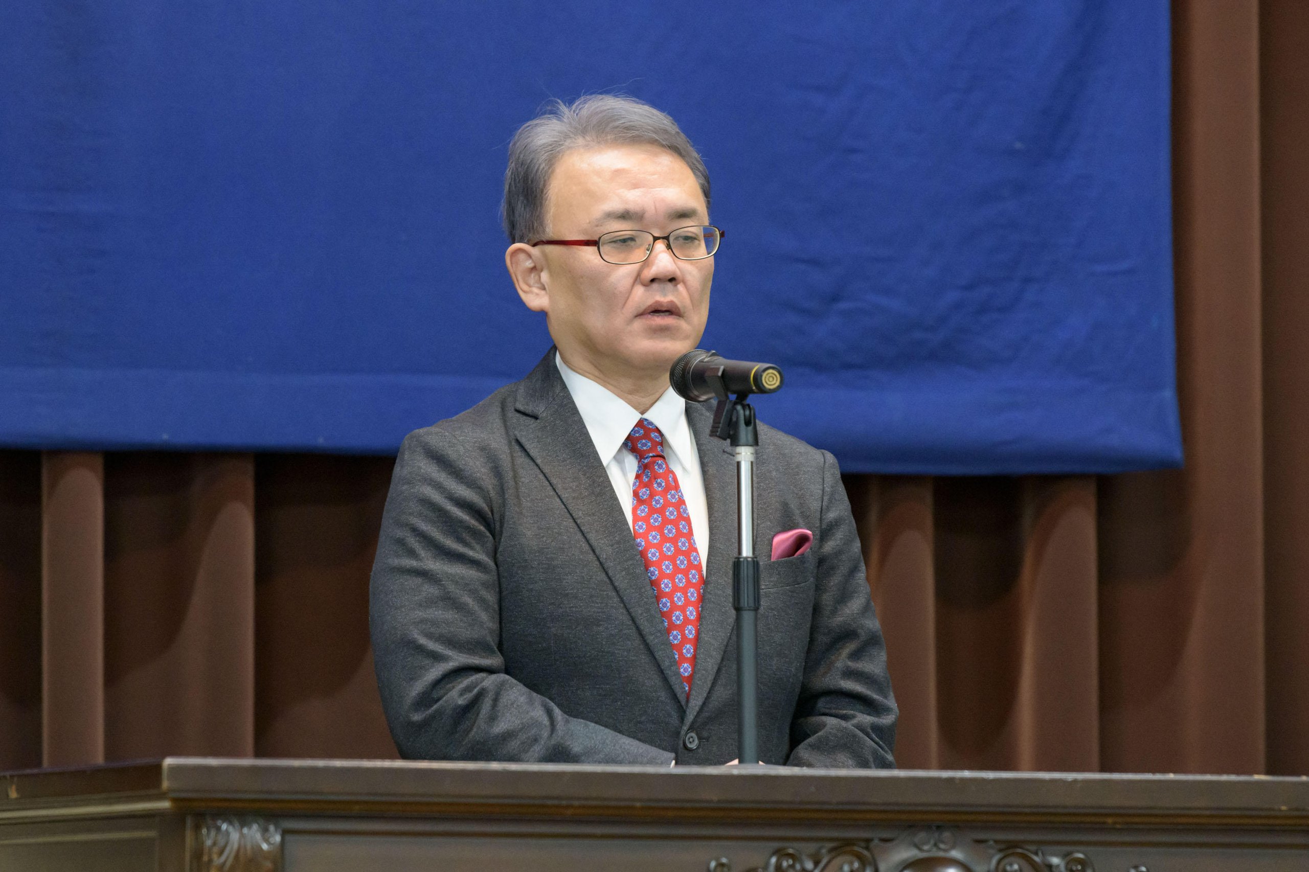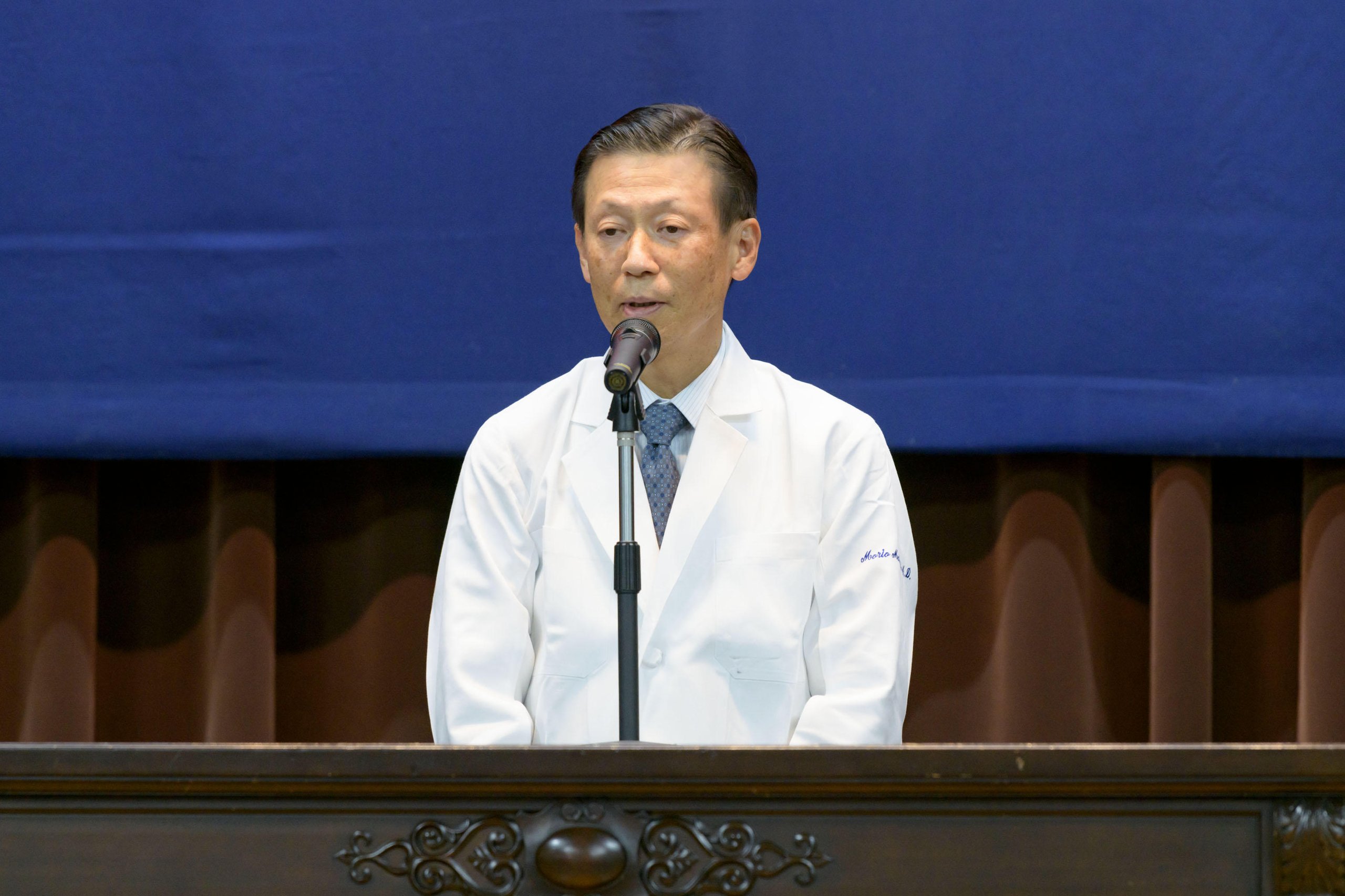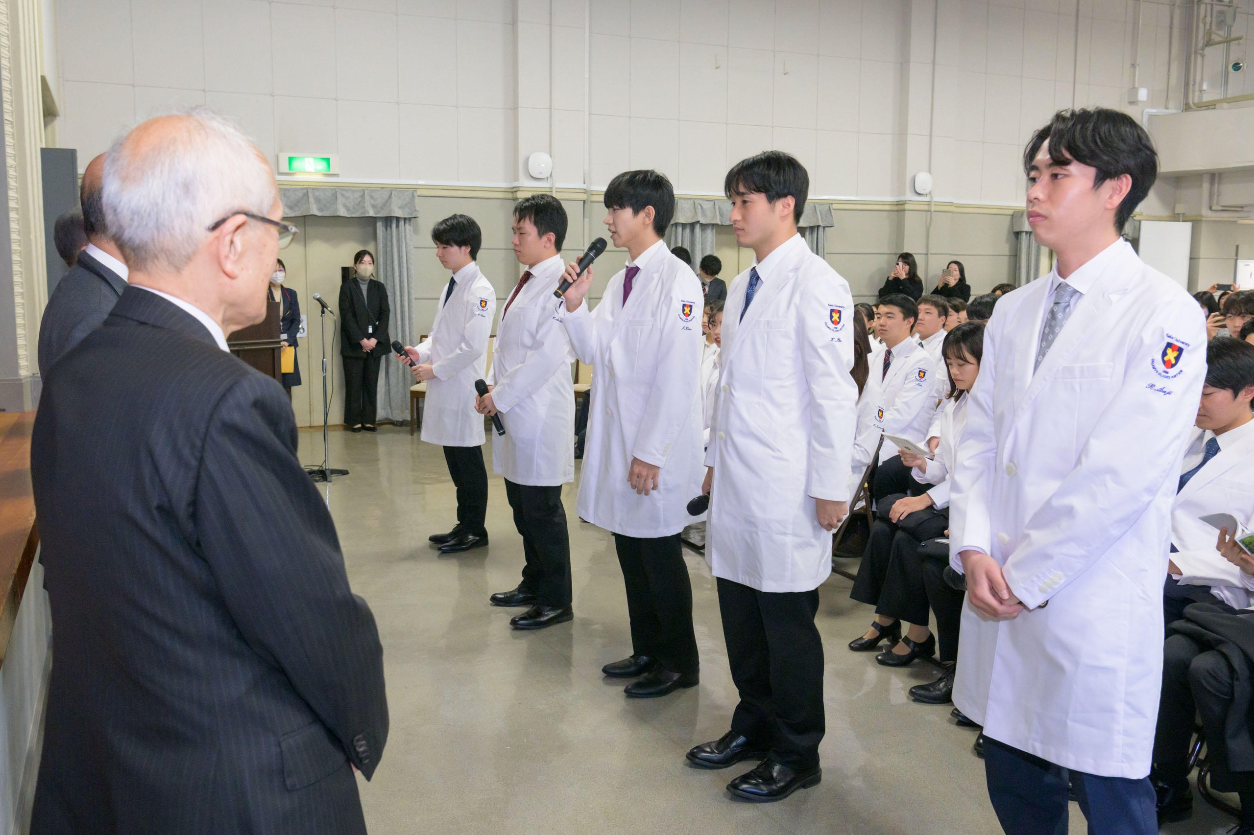 At the ceremony, Takanori Kanai, Dean of the School of Medicine; Morio Matsumoto, Hospital Director; and Junzo Takeda, Chairman of the School of Medicine Sanshikai, delivered addresses. They spoke about the importance of listening to patients' voices and making judgments with deep observational skills as the students begin their training in a clinical setting, offering advice and words of encouragement for their journey as medical professionals.