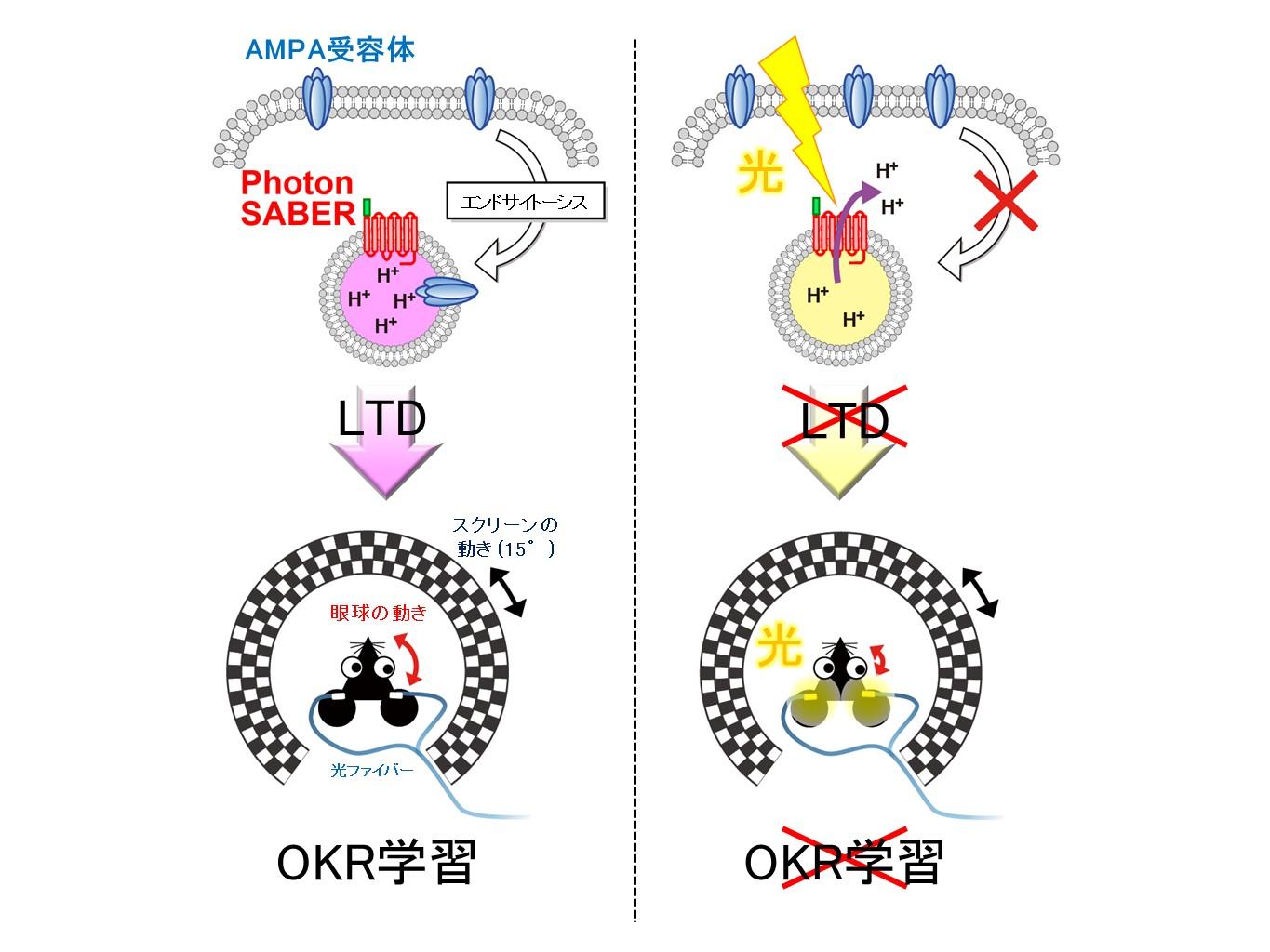 In recent years, it has been suggested that the physical basis of memory and learning is the increase or decrease in the number of AMPA-type glutamate receptors (AMPA receptors), which are responsible for synaptic transmission. For example, motor memory, which is learned through physical practice, has been thought to depend on the activity-dependent endocytosis of AMPA receptors in cerebellar synapses and the associated long-term depression (LTD) of synaptic transmission efficiency. However, recent reports of genetically modified mice lacking molecules involved in LTD that can still perform motor learning normally have raised the need to reconsider whether a causal relationship exists between memory and learning at the organismal level and LTD at the synaptic level. To answer this fundamental question, we have developed a new optogenetic tool (PhotonSABER) that can reversibly inhibit AMPA receptor endocytosis with light. Interestingly, in mice expressing PhotonSABER in the cerebellum, both LTD and motor memory were normal without light irradiation, whereas both were significantly impaired under light irradiation. This allowed us to directly prove that LTD in cerebellar synapses is a crucial event for motor memory and learning. This achievement is expected to provide valuable information for understanding the molecular basis of memory and learning.