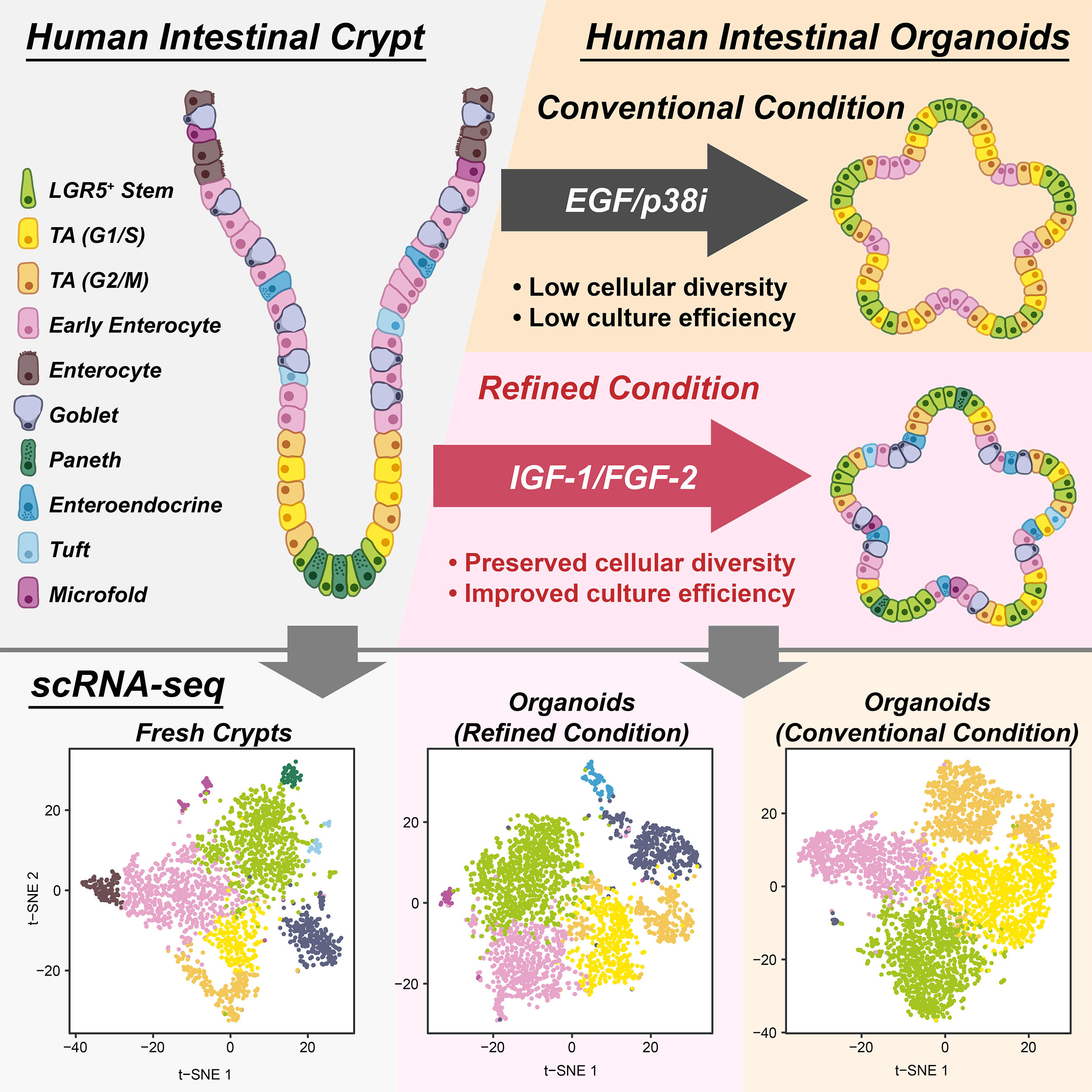 Many tissues in the body form beautiful three-dimensional structures. Each tissue cell has its own specific rules, and it is believed that emergent self-organization occurs based on these rules. While conventional cell culture methods typically involve growing a single type of cell as a monolayer on a culture dish, a technique for creating three-dimensional structures called "organoids," which utilizes the self-organizing ability of tissue cells, is gaining attention. We have reported that organoids with a glandular structure can be created from just a single intestinal epithelial stem cell, and various researchers in Japan and abroad are developing organoid technologies for all kinds of tissues. While mouse intestinal epithelial organoids can produce all differentiated cell types, human intestinal epithelial organoids could only produce some, and it was difficult to form "cloned" organoids from a single cell. In this study, we aimed to develop an optimal culture technique for human intestinal organoids. With the new culture method, using the growth factors IGF1 and FGF2, we succeeded in creating human intestinal organoids capable of differentiating into all types of intestinal epithelial cells and in the long-term culture of rat intestinal organoids, which had previously been difficult. This technology is expected to be applied to human intestinal disease models and regenerative medicine in the future.