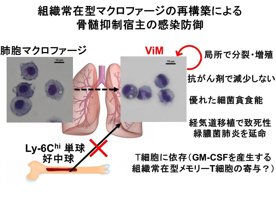 When bone marrow function is suppressed by chemotherapy, immune cells such as neutrophils decrease, increasing the host's risk of infection. It has recently become clear that some macrophages, a type of white blood cell resident in tissues, appear during the embryonic stage and are subsequently maintained autonomously within the tissue without relying on the bone marrow. We hypothesized that by remodeling the immunological environment of the lungs, particularly the tissue-resident macrophages, we could compensate for the decline in host immunity associated with myelosuppression, and we tested this hypothesis in an animal model. By administering a vaccine to mice via the airway, we were able to induce anti-Pseudomonas aeruginosa immunity that is independent of neutrophils and monocytes, with lung macrophages, assisted by T lymphocytes, as the main effectors. Furthermore, in the lungs after vaccine administration, we found a group of macrophages (ViM) with different characteristics from alveolar macrophages (AM), which are maintained by local cell division. While gene expression and other factors suggest that ViM are derived from AM, it was also found that, unlike AM, they do not decrease with anticancer drug administration and possess superior antibacterial activity. In the future, by elucidating in detail the mechanism by which ViM are induced and maintained, we hope to lead to new strategies to protect myelosuppressed patients from severe infections.