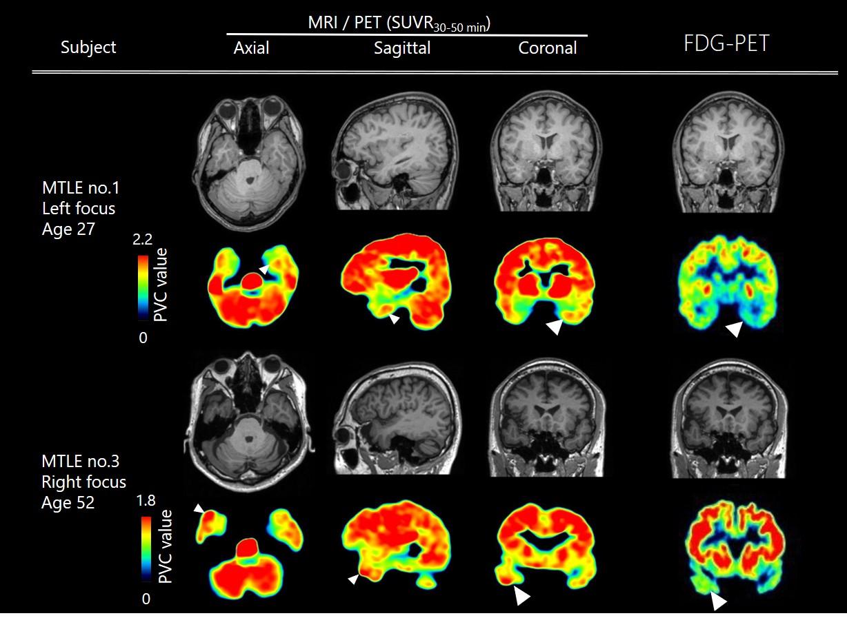 A research group led by Professor Takuya Takahashi and Associate Professor Tomoyuki Miyazaki of the Department of Physiology, Yokohama City University Graduate School of Medicine, in collaboration with the National Institutes for Quantum and Radiological Science and Technology and Keio University, has succeeded for the first time in the world in developing a tracer (compound) for positron emission tomography (PET) that visualizes AMPA receptors—the most critical molecules for brain function—in the living human brain. Using this tracer, they successfully observed a high accumulation of AMPA receptors in the focal region of medial temporal lobe epilepsy (see figure). AMPA receptors are the most important molecules supporting brain function. Visualizing these molecules in the living human brain is expected to dramatically advance the elucidation of the pathophysiology of psychiatric and neurological disorders, which has been a black box until now, and lead to the development of innovative diagnostic and therapeutic methods based on this information. Currently, using this PET tracer, a multi-center, investigator-initiated clinical trial is underway at eight institutions nationwide, with Yokohama City University Hospital as the lead institution, aiming for regulatory approval of a diagnostic agent for epilepsy. It is also being used in a clinical trial for post-stroke patients of Edonerpic Maleate (Abe et al., *Science* 2018), a drug identified by the same group in 2018 to promote the effects of post-stroke rehabilitation, to verify its effectiveness as a biomarker for functional recovery. The group is also conducting imaging of patients with psychiatric disorders in collaboration with the Department of Psychiatry at Keio University, the University of Fukui, Kyushu University, and others.