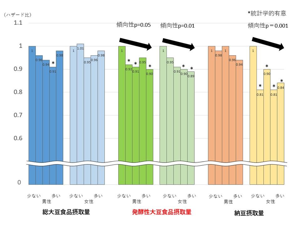 Our research group is conducting a cohort study (JPHC Study) to clarify the association between various lifestyle habits and diseases such as cancer and cardiovascular disease, with the aim of contributing to the prevention of lifestyle-related diseases and the extension of healthy life expectancy for the Japanese population. In this paper, we prospectively examined the association between the intake of soy products and fermented soy products and the risk of mortality by following approximately 90,000 men and women aged 45-74 who responded to a dietary survey conducted from 1995-98 until 2012. Soybeans contain various components such as protein, dietary fiber, minerals, and isoflavones. Fermented soy foods like natto and miso, in particular, are expected to have a beneficial effect on health because their components are less likely to be lost during processing. The results showed no clear association between total soy product intake and mortality risk, but for both men and women, a higher intake of fermented soy products was associated with a lower risk of mortality. Furthermore, a higher intake of natto was shown to be associated with a lower risk of death from cardiovascular disease. Although there are limitations to this observational study, the findings suggest that foods unique to Japan may contribute to the longevity of the Japanese people.