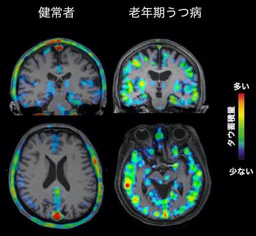 In this study, we used positron emission tomography (PET) technology to visualize tau in the living brain, non-invasively measuring the accumulation of tau and amyloid-β in the brains of elderly patients with major depressive disorder and examining the relationship with clinical symptoms. The results showed that some elderly patients with major depressive disorder had significantly higher tau accumulation in the cerebral cortex, and that brain tau accumulation was particularly pronounced in patients with psychotic symptoms such as delusions and auditory hallucinations (Figure). Next, to validate these findings, we accessed postmortem brain data from the Elderly Brain Bank Project and found tau accumulation in some cases diagnosed with depression. These results indicate that objective diagnosis of major depressive disorder in the elderly may become possible using tau accumulation in the living brain, as captured by PET, as a biomarker. Furthermore, it is hoped that new therapeutic drugs being developed as radical treatments for dementia that suppress brain tau accumulation may also be effective for major depressive disorder in the elderly.