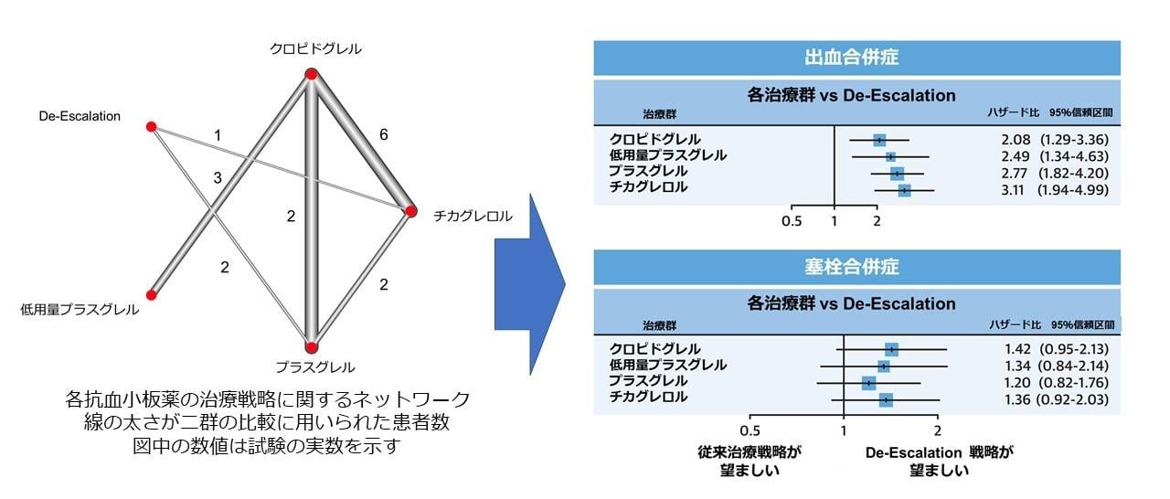 After treatment for acute coronary syndromes, "dual antiplatelet therapy" (aspirin and a P2Y12 inhibitor) is required. Regarding P2Y12 inhibitors, new-generation drugs with more potent effects have recently been developed, and their use is becoming a global trend. However, potent antiplatelet drugs also increase the risk of bleeding, which has been a major issue, particularly in Japan (Shoji et al., JAMA Netw Open 2020). The strategy of "de-escalation" of antiplatelet therapy was therefore proposed. Unfortunately, however, the randomized controlled trials (RCTs) conducted on this strategy have been small, and it has been difficult to make firm recommendations regarding "de-escalation." Therefore, Shoji, Kuno, and Kohsaka aggregated data from 15 trials and conducted a network meta-analysis to investigate the merits of this strategy. The results exceeded previous expectations, suggesting that the de-escalation strategy not only prevents bleeding complications but also helps prevent the recurrence of thrombotic complications (Figure). This work, originating from Asia, is expected to significantly contribute to future clinical practice guideline recommendations worldwide.
