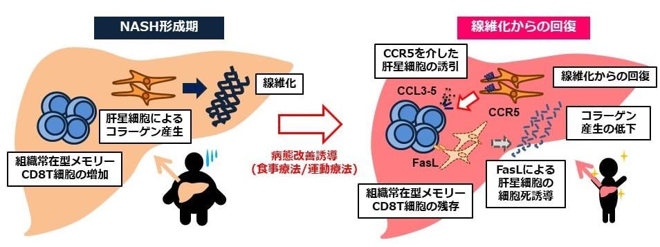 Nonalcoholic steatohepatitis (NASH) presents with liver inflammation and hepatocyte ballooning and carries the risk of progressing to cirrhosis and liver cancer, but no effective medical treatment currently exists. Traditionally, liver fibrosis was considered irreversible, but this established theory is being overturned by reports of cases where liver fibrosis improved after the hepatitis virus was eliminated with therapeutic drugs. In a joint study with the Department of Pathology, we reproduced the process of NASH pathology in mice—from onset and progression to recovery through dietary therapy—and discovered that during the recovery phase, "tissue-resident memory CD8 T cells (CD8 Trm)" are involved in the resolution of liver fibrosis. Furthermore, we clarified that CD8 Trm cells promote recovery from fibrosis by inducing apoptosis in hepatic stellate cells, the main culprits in fibrosis, via the Fas ligand (Figure 1). These cells have also been confirmed in the liver tissue of NASH patients, and it is hoped that the results of this research will lead to the development of future treatments and diagnostic agents for fibrotic diseases of the liver and other organs.