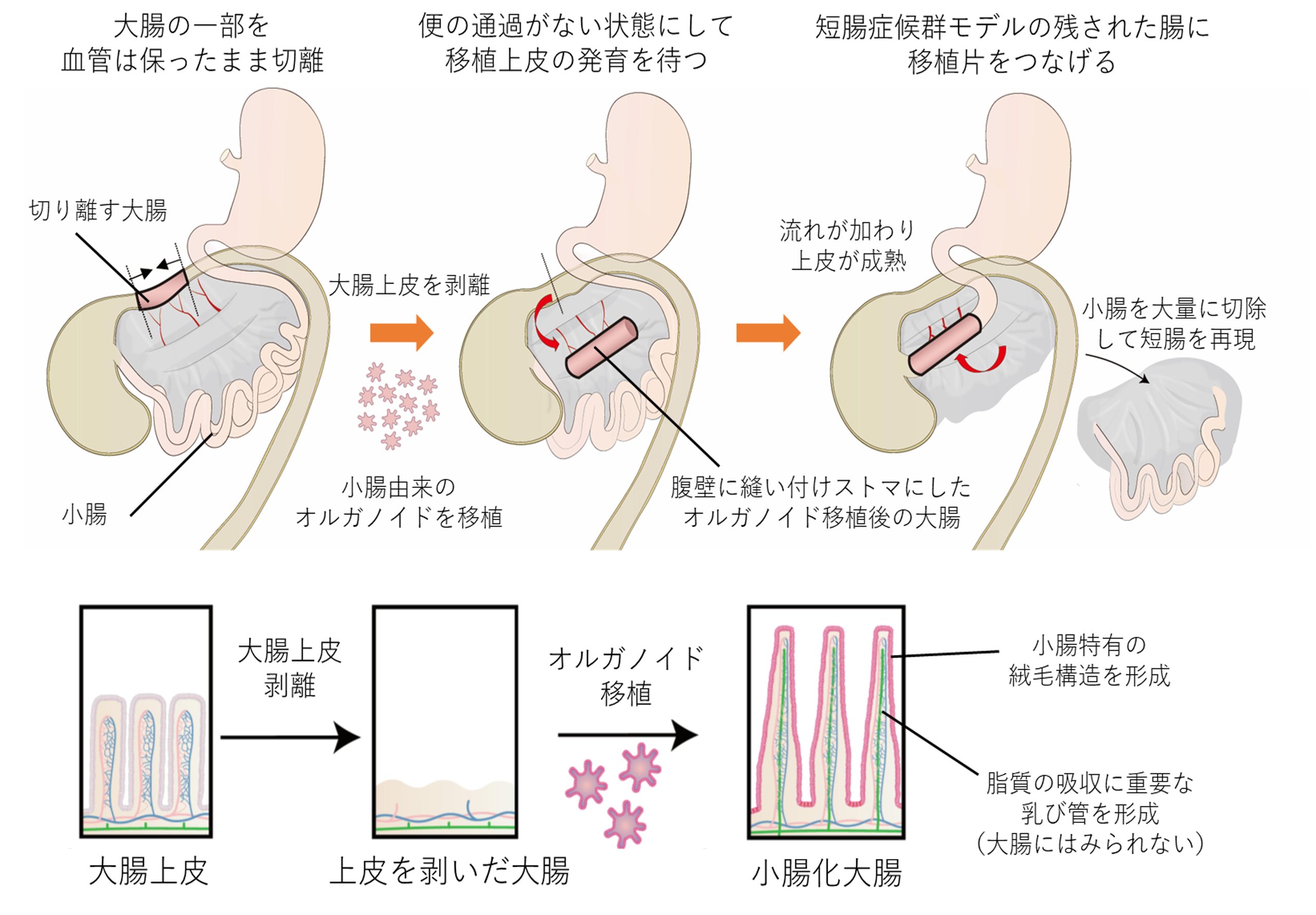 Small bowel transplantation, the only curative treatment for severe cases of short bowel syndrome caused by massive resection of the small intestine, is performed in very few cases due to problems such as strong rejection compared to other organs and donor shortages. Although expectations are high for regenerative medicine, it has been impossible to create an entire small intestine with its complex structure, including functions like digestion, absorption, and peristalsis, as well as its epithelium, stroma, lymphatic and vascular systems, nerves, and muscle layers. Focusing on the similarity between the large and small intestines below the submucosal layer, we have developed a technique to "small-intestinalize" the colon by stripping its epithelium and replacing it with small intestine-derived organoids. Leveraging the discovery that flow is crucial for its maturation, we successfully demonstrated the proof-of-concept in rats, using the small-intestinalized colon to treat short bowel syndrome. This technology, which can be applied to human-sized intestines and repurposes a patient's own existing organ into another needed organ, is a step forward in realizing rejection-free organ transplantation through regenerative medicine. It is also expected to serve as a research method that will lead to a better understanding of the pathophysiology of various small intestinal diseases.
