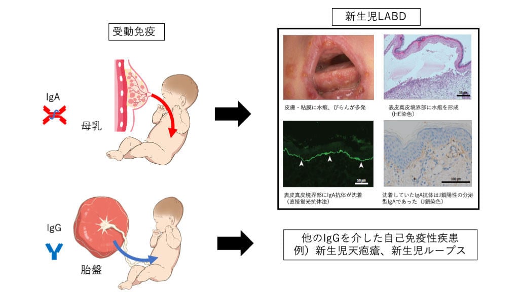 Neonatal linear IgA bullous dermatosis is a rare disease that causes blisters and erosions mediated by IgA that reacts with the dermoepidermal junction. Lesions frequently occur not only on the skin but also on the mucous membranes of the respiratory tract, leading to a potentially fatal condition. While many neonatal autoimmune skin diseases are caused by maternal autoantibodies in the blood passing through the placenta to the fetus, in linear IgA bullous dermatosis, past reports have shown no pathogenic antibodies in the maternal blood, and their origin was unknown. In this study, we demonstrated the presence of IgA that binds to the dermoepidermal junction in the breast milk of the affected infant's mother using indirect immunofluorescence. Furthermore, by immunostaining the perilesional skin for the J chain, we found that the IgA deposited on the infant's skin was the secretory type (different from the IgA in serum), which is specifically present in breast milk. This proved that pathogenic IgA was transferred to the infant via breast milk. This suggests that in neonatal IgA bullous dermatosis, promptly discontinuing breastfeeding can prevent the infant's condition from becoming severe and can be life-saving.