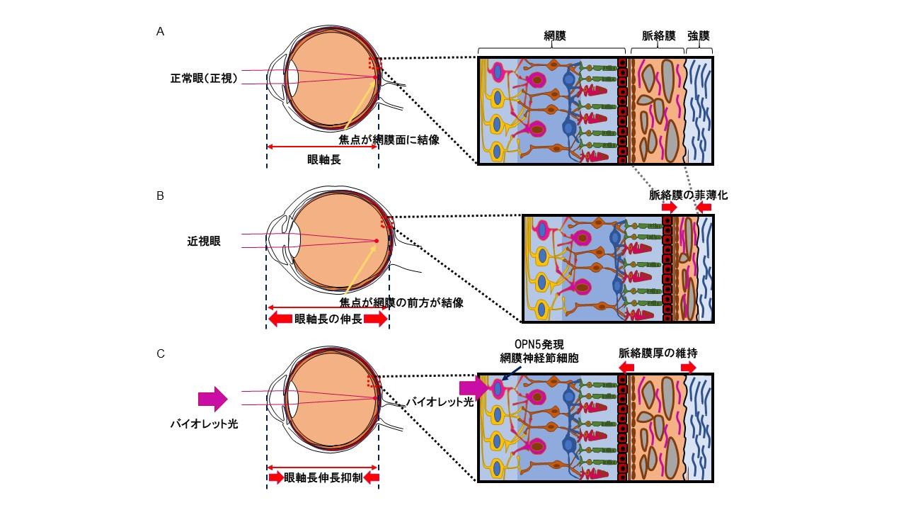 In recent decades, the prevalence of myopia has increased dramatically worldwide, and it is said that one-third of the human population is now myopic. Most cases of myopia are classified as axial myopia, the essence of which is an elongation of the eye's front-to-back length (axial length). This deformation of the eyeball can lead to complications that cause blindness, such as retinal detachment and macular disease. In recent years, the myopia-suppressing effect of violet light (360 nm–400 nm, a short-wavelength region of visible light) abundant in outdoor ambient light has been clarified, and it is speculated that a lack of violet light due to reduced outdoor activities is a contributing factor to the rapid increase in myopia prevalence. This study elucidated the mechanism by which violet light suppresses myopia progression by maintaining choroidal thickness. This process is initiated when violet light is received by the photoreceptor OPN5 (neuropsin), which is expressed in retinal ganglion cells in the inner layer of the mouse retina and is involved in local retinal circadian rhythms, intraocular vascular development, and deep body temperature regulation. This finding not only clarifies the molecular mechanism of violet light's effect on suppressing myopia progression but also contributes to elucidating the function of the recently discovered non-visual photoreceptor OPN5. It is expected to aid in the future development of useful interventions targeting myopia progression.