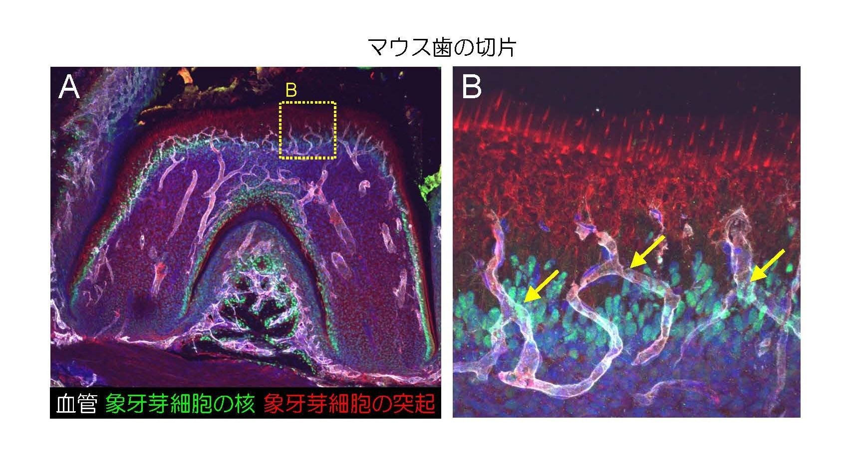 Teeth are harder than bone, making them the hardest structures in the human body. Because their hardness made it nearly impossible to perform experiments such as cutting sections, as is done with other soft tissues, the process by which teeth harden was poorly understood. In this study, we first succeeded in cleanly sectioning mouse teeth by making various improvements to conventional methods. Applying this method, we then established an imaging technique to observe dental vasculature three-dimensionally at the single-cell level. Using this technique to observe the developmental process of dental blood vessels in detail, we discovered a unique population of vascular endothelial cells that cluster around odontoblasts—the cells responsible for tooth hardening. These endothelial cells promote odontoblast maturation and supply minerals necessary for hardening, such as phosphorus. Furthermore, when we created genetically modified mice in which only these specific vascular endothelial cells were ablated, we found that the teeth failed to harden. This research holds promise for future applications in the regeneration of teeth lost to cavities, periodontal disease, or other causes.