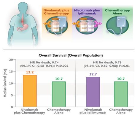 For a long time, the standard of care for metastatic or recurrent esophageal squamous-cell carcinoma has been systemic chemotherapy with cytotoxic anticancer drugs, but the prognosis has been extremely poor. Recently, nivolumab and ipilimumab—antibody drugs targeting tumor-cell programmed death-1 (PD-1), which suppresses the function of antigen-specific T cells in tumor tissue, and cytotoxic T-lymphocyte antigen-4 (CTLA-4)—have been developed as immune checkpoint inhibitors and have shown efficacy in many types of cancer. This international, multicenter, phase III trial was designed to evaluate the efficacy of nivolumab plus chemotherapy and nivolumab plus ipilimumab versus chemotherapy alone. A total of 970 patients were enrolled. As a result, both the nivolumab-plus-chemotherapy group and the nivolumab-plus-ipilimumab group demonstrated superiority to the chemotherapy-alone group with respect to the primary endpoint of overall survival. This study is the world's first to report the efficacy of a two-drug immune checkpoint inhibitor combination therapy for esophageal cancer. In addition to improving treatment outcomes for metastatic or recurrent esophageal squamous-cell carcinoma, there are high expectations for verifying its efficacy in perioperative chemotherapy for surgically resectable esophageal cancer.