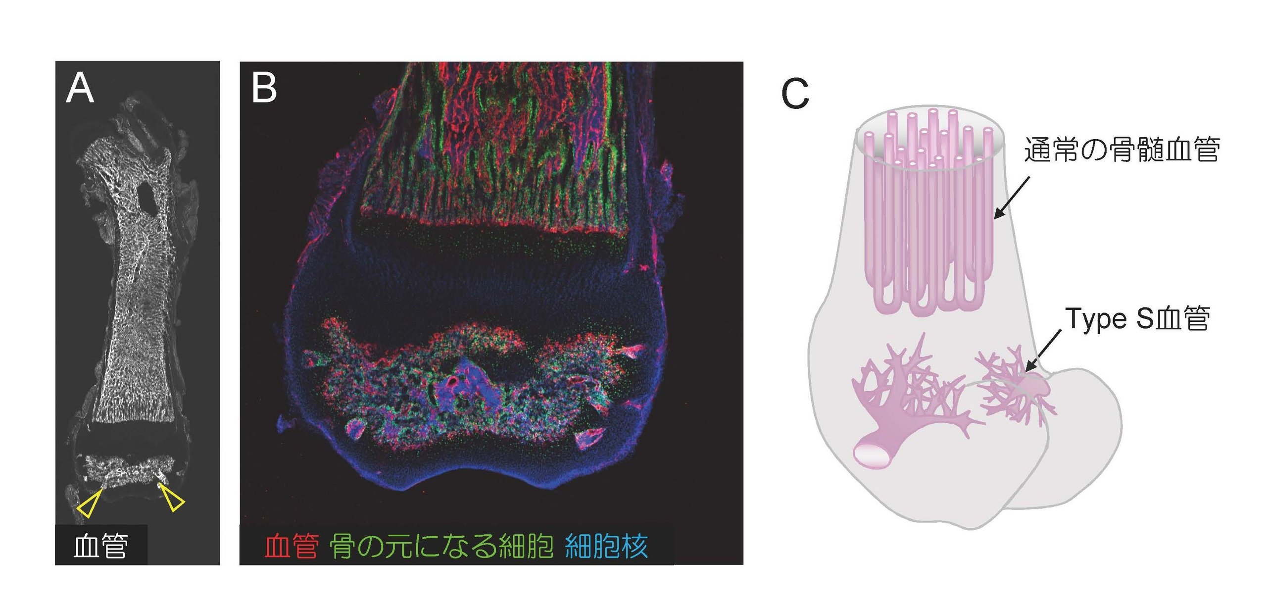 Bones not only support the body and protect internal organs like the brain, but their interior (bone marrow) also contains hematopoietic stem cells that produce blood cells such as red and white blood cells daily and deliver them throughout the body. The blood vessels in the bone marrow are crucial for both this skeletal role and the role of blood production. However, unlike soft tissues, the task of "slicing sections" of bone for detailed observation is difficult due to its hardness. Consequently, our understanding of bone marrow blood vessels has lagged behind that of vessels in other organs. Through improvements in conventional tissue sectioning methods, single-cell analysis, and the creation of new genetically modified mice, this study discovered a previously unknown subtype of bone marrow blood vessels in the end of the bone (the epiphysis) that is important for bone development and blood production. Although the epiphysis is a critical site in human diseases such as femoral neck fractures and avascular necrosis of the femoral head, it has traditionally been cut off with scissors and discarded for convenience when analyzing mouse bones and bone marrow, and thus has been largely unstudied. In the future, the discovery of this unique vascular subtype is expected to advance our understanding of these diseases.
