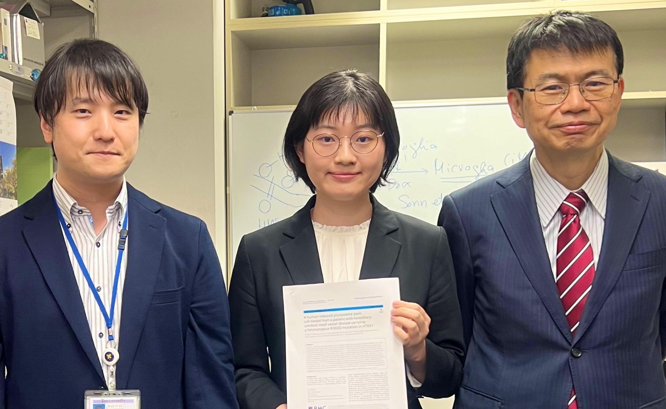 Inflammation and the accumulation of abnormal proteins are cited as causes of cerebral small vessel disease, such as Binswanger's disease, which causes dementia and motor symptoms due to cerebral arteriolosclerosis. However, the detailed pathogenic mechanism is unknown, and hereditary cerebral small vessel disease is being focused on as a clue to elucidating the pathology. HTRA1, the causative gene for CARASIL, an autosomal recessive hereditary cerebral small vessel disease, has recently been found to cause cerebral small vessel disease even with a heterozygous mutation. In this study, a research group including Emi Qian, a sixth-year student at the School of Medicine, Satoru Morimoto, a Project Lecturer at the School of Medicine's Department of Physiology, and Professor Hideyuki Okano, in collaboration with Niigata University, established the world's first iPS cells from a patient with cerebral small vessel disease carrying a heterozygous mutation in HTRA1. They found that HTRA1 expression was reduced compared to iPS cells derived from healthy individuals. Furthermore, they observed increased expression of NOGGIN, whose expression level increases with the activation of the TGF-β signal, suggesting a mechanism in which the HTRA1 mutation causes disinhibition of the TGF-β signal, leading to vascular lesions. These iPS cells are expected to be applied to further pathological analysis research by differentiating them into diseased cells.
