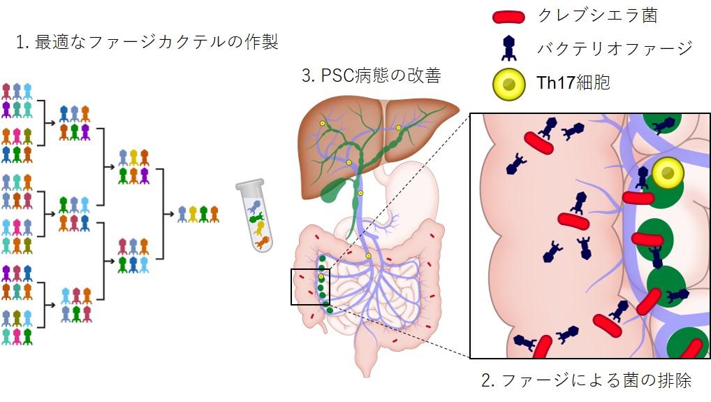 Primary Sclerosing Cholangitis (PSC) is an intractable autoimmune disease that causes damage to the large and small bile ducts inside and outside the liver, leading to cholestasis. The etiology of PSC is still unknown, and there are no effective medical treatments; the only curative therapy is liver transplantation. In this study, we analyzed the gut microbiota of 45 PSC patients visiting our hospital and found that patients harboring both *Klebsiella pneumoniae* (Kp) and *Enterococcus gallinarum* had more rapid disease progression. While antibiotics to which these pathogens are susceptible are a potential therapeutic approach, the emergence of resistant bacteria due to long-term use is a concern. To overcome this problem, we initiated the development of bacteriophages, which can selectively kill specific pathogenic bacteria with a low frequency of resistance emergence. Through international collaboration, we successfully created a bacteriophage cocktail that specifically eliminates Kp isolated from PSC patients. We demonstrated that its administration reduces the Kp bacterial load and attenuates bile duct damage mediated by the Th17 immune response (Figure 1). This achievement clarifies the role of gut bacteria contributing to the pathophysiology of PSC and is expected to lead to the clinical application of phage therapy targeting gut microbiota in the future.