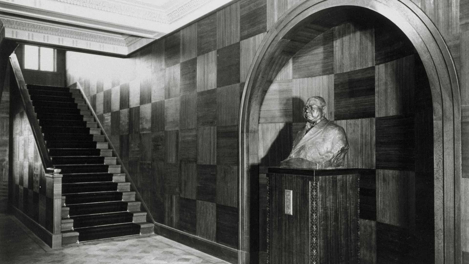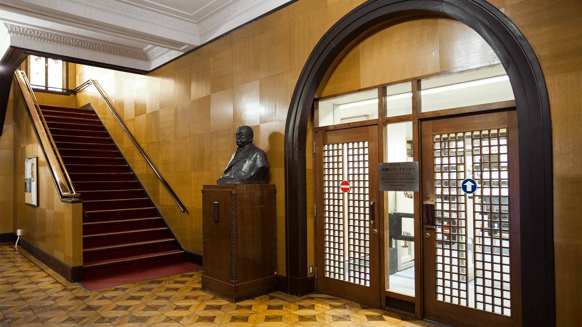 Kitasato Memorial Medical Library First-Floor Lobby A bronze statue of Dr. Shibasaburo Kitasato was installed in the first-floor lobby of Kitasato Memorial Medical Library, directly facing the entrance.