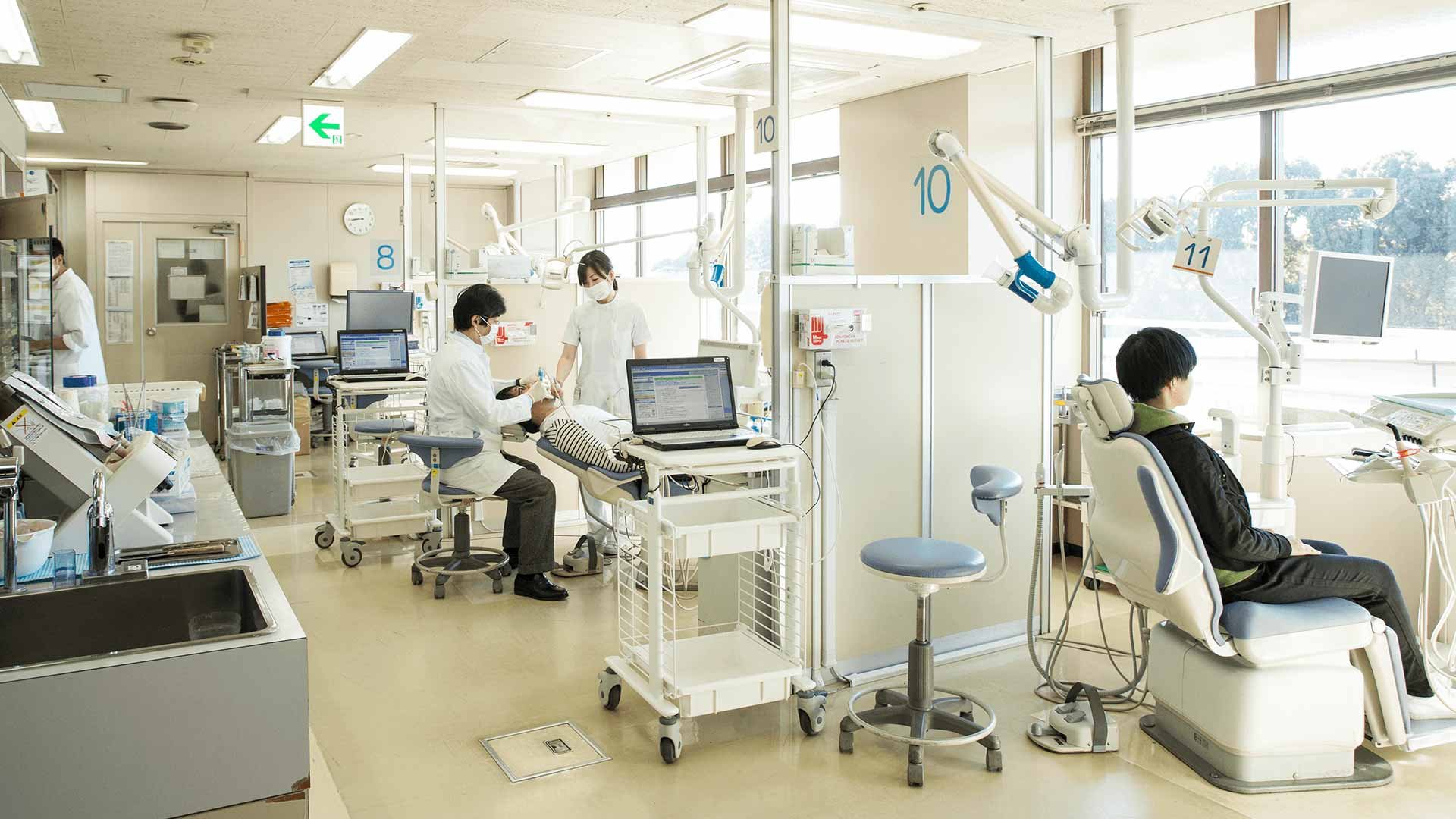 Currently, the dental division, which provides dental treatment for patients with systemic diseases, and the oral surgery division, which handles conditions such as tumors, jaw deformities, and mucosal diseases, work in close collaboration to provide patient care. Although the layout of the treatment room remains unchanged, its technology and scope of practice continue to expand, including the shift from seated to supine treatment positions.