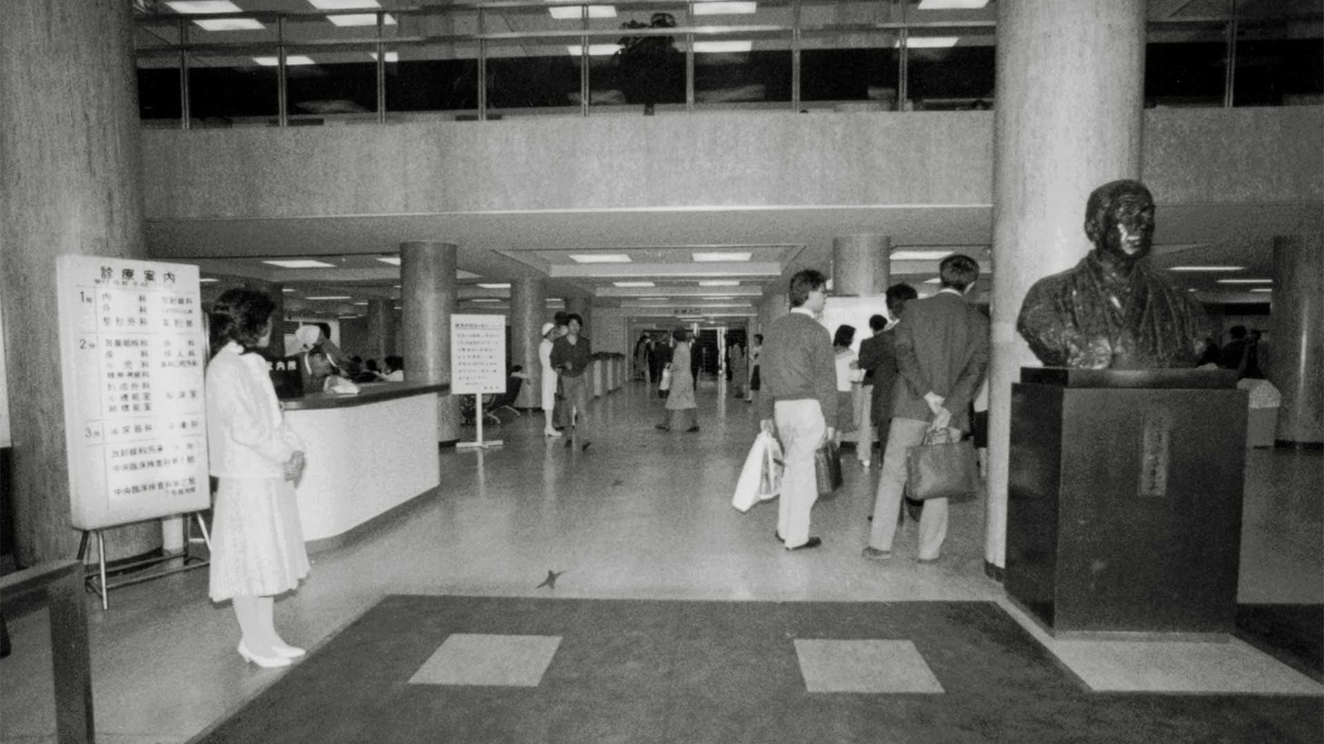 Hospital Entrance (Central Building and New Building). In 1986, the new university hospital building (now Building 2) was opened as part of the 125th-anniversary project of Keio University. This photo shows the building at the time of its completion ceremony. The Central Building is in the foreground, and the New Building extends behind it. A Bronze Statue of Yukichi Fukuzawa was installed at the entrance.