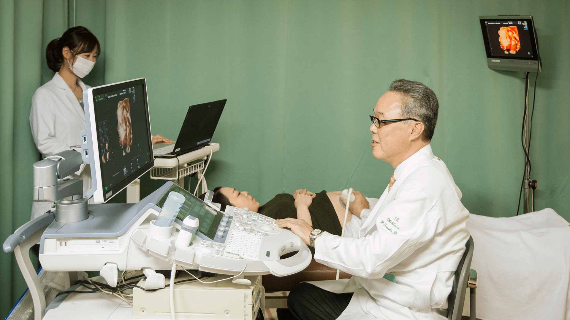 Modern obstetrics and gynecology consultation rooms are categorized by function to cover all events in a woman's life cycle, from gynecological oncology to women's medicine. These rooms incorporate advanced, privacy-conscious technology. The image shows an obstetrics ultrasound room performing 4D (real-time 3D) fetal ultrasound diagnosis, a technology absent at the facility's founding. Laptop computers have replaced pens and ink, and monitors are installed for patients and families.
