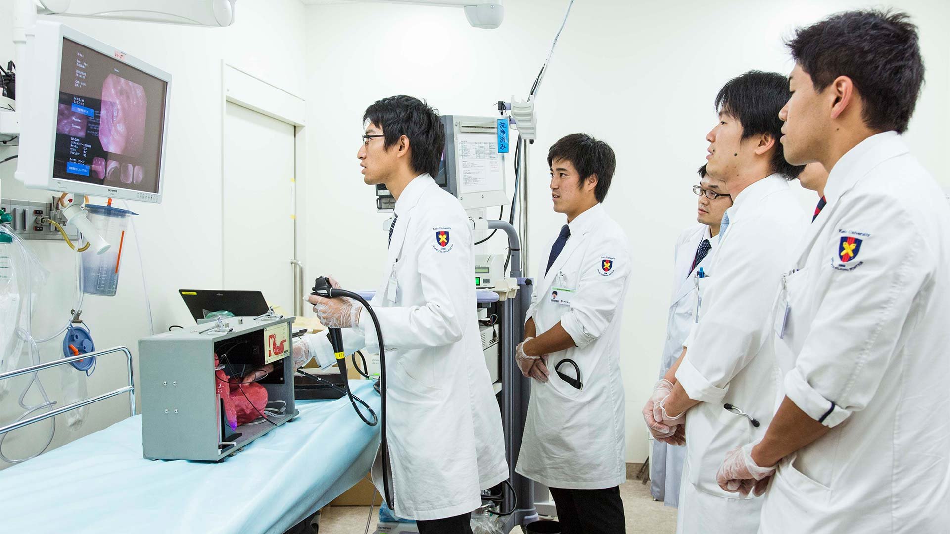 This image shows an endoscopic simulation training session. Clinical training is conducted in small groups (6-7 students) from the 5th year through the second semester of the 6th year. This participatory clinical training allows students to deepen medical knowledge through direct patient contact and learn essential abilities like responsibility, leadership, and cooperation. Practical training using the latest simulators is also actively employed.