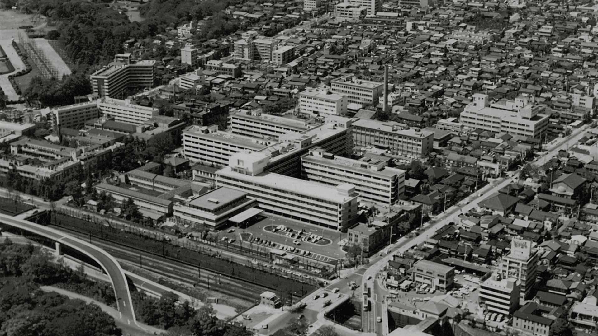 Aerial view of Shinanomachi Campus (1965). University Hospital Building 1, a 5-story reinforced concrete structure with one basement level, was completed in 1965. It connects to Buildings 2, 6, and 7 via the central building. Behind the main entrance was the Nursing School, which trained nurses for over 50 years starting in 1917, and an annex ward. The site area was approximately 23,000 tsubo (approx. 76,000 sq meters).