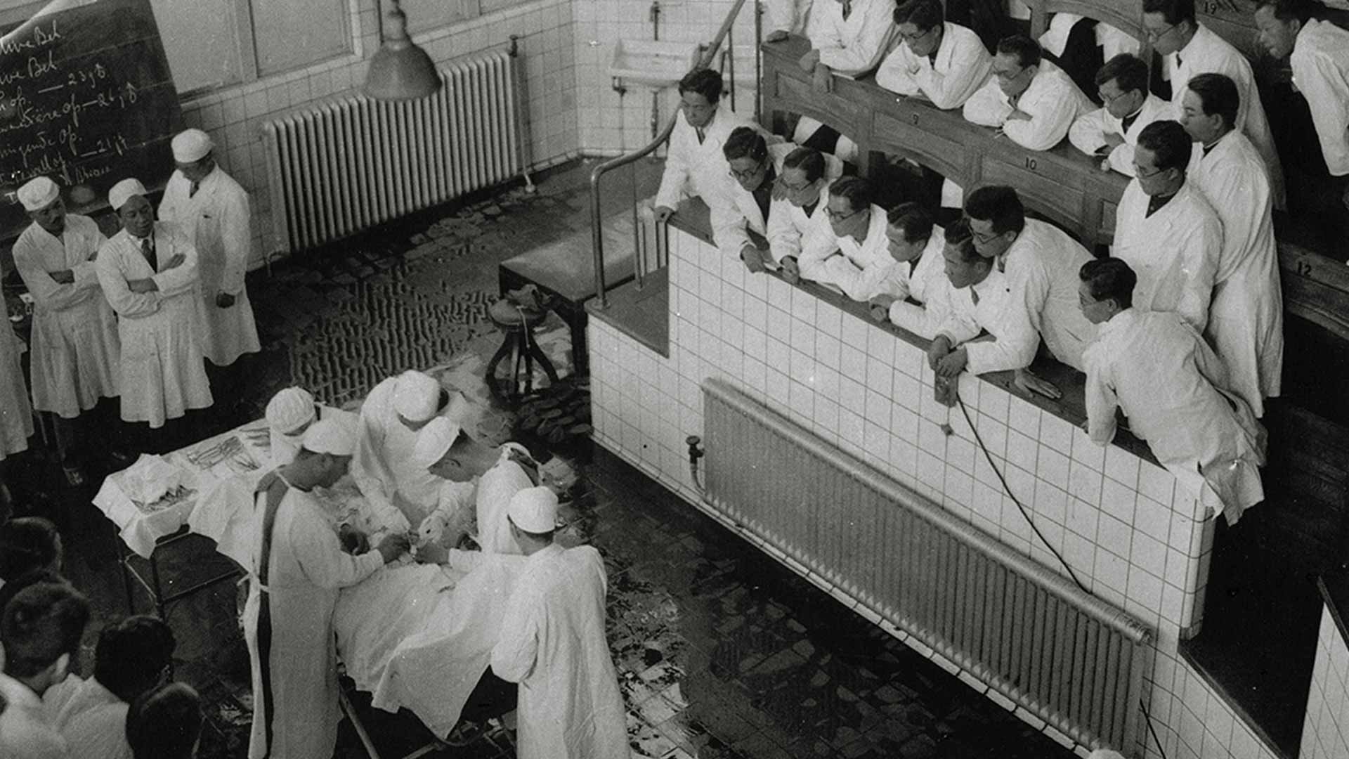 Clinical Training of the Time A scene from a surgery clinical lecture. At the time, classes were held in lecture halls designed so that students could look down from above to learn while observing actual clinical cases.