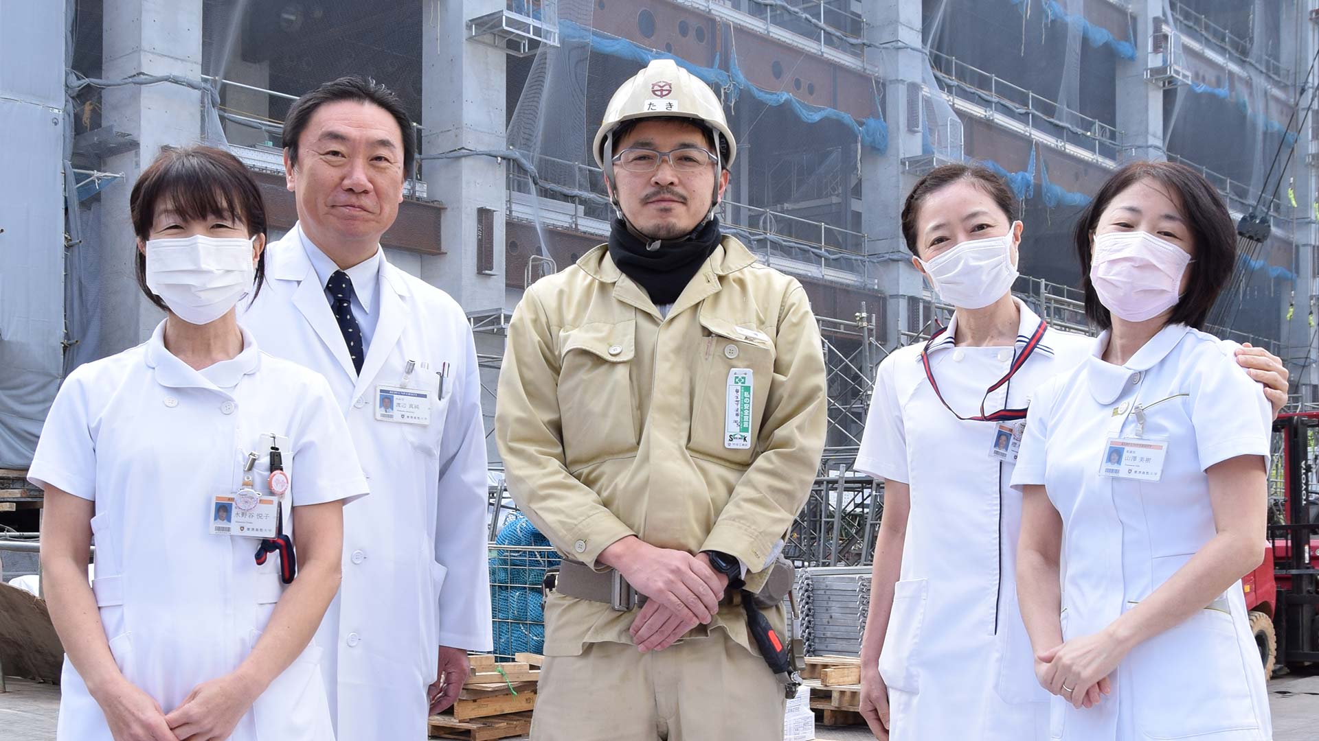 Masumi Watanabe (second from left) inspecting the construction site of new hospital building (Building 1) at Keio University Hospital.